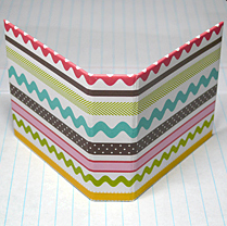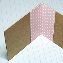 - Углы цветной бумаги срежьте так, как показано на рисунке. Заверните края цветной бумаги внутрь заготовки и приклейте к картону. Все, обложка готова.