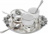 В-третьих, конечно же, посуда, начиная с парных кружек, бокалов, сервизов и заканчивая серебряными ложками.