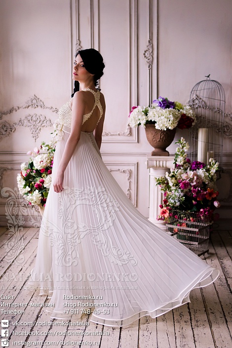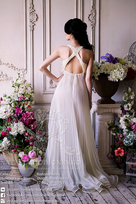 Платье А-силуэта со струящейся от линии груди юбкой из гофрированной вуали подчеркнет вашу женственность, формируя четкие линии фигуры. Низ юбки декорирован лентой из регилена, что придает мягкому струящемуся материалу обрести устойчивую форму по низу образуя красивые волны по подолу. Лиф платья имеет красивый, глубокий вырез в форме "каре"что акцентирует внимание на красивой зоне декольте. Лиф выполнен из шелкового атласа и вручную расшит множеством жемчужин различного диаметра. Линия соединения лифа с юбкой подчеркнута лентой и невесомым художественным бантом . На спине лиф переходит в бретели изящной и необычной формы образуя красивый вырез ниже лопаток , бретели застегиваются на маленькие пуговки посередине спины.