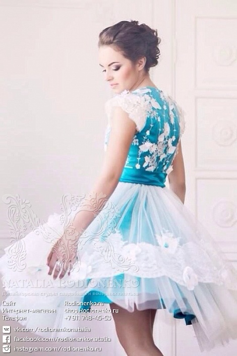Яркое бирюзовое платье в сочетании с цветочным кружевом цвета "айвори" – неординарный и прекрасный образ для невесты. Платье имеет длину до уровня колен и пышную юбку на подъюпнике из фатина, нижний слой юбки – атлас цвета бирюзы, перекрыт несколькими слоями тонкого молочного фатина и кружевом с объемными цветами цвета "айвори ".Верхняя часть ансамбля имеет ту же бирюзовую основу ,округлый вырез горловины декорирован объемными цветами из кружева, весь лиф также украшен кружевными элементами с менее объемным рисунком. Сердцевина цветов выполнена из кристаллов бирюзового оттенка.Платье застегивается по середине спинки на молнию. В этом наряде вы будете исполнены скромного очарования юной принцессы и почувствуете как вы восхитительно красивы!