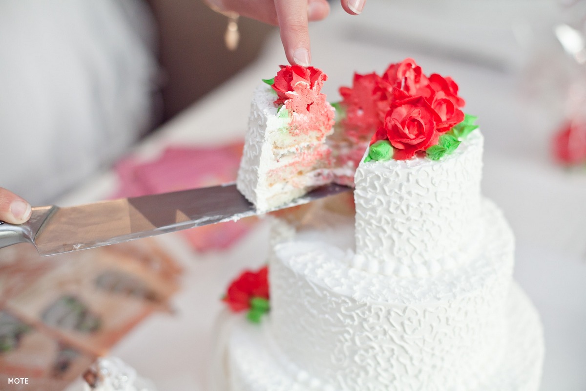 В конце вечера с 18:30 до 19:00 проводился свадебный обряд, а именно все свадебные традиции, которые часто применяют уже по приезду на место проведения банкета. В завершении обряда, молодоженам была предоставлена возможность в разрезании свадебного торта.