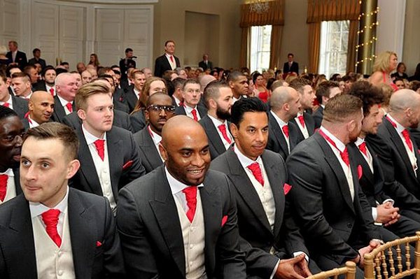 Помощь в организации мероприятия оказали свадебные специалисты, сшившие специально для их свадьбы 130 одинаковых платьев подружек невесты и 100 костюмов для друзей жениха.
