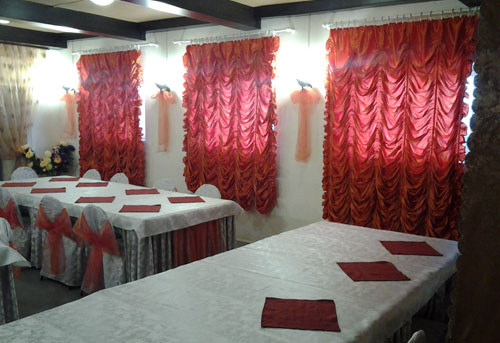 - Банкетный зал. Рассчитан на44 персоны, оснащён звуковым и видео-оборудованием, а также к Вашим услугам: танцпол, светомузыка, неон, диджей + пульт, музыка на заказ, домашний кинотеатр и плазменный экран;